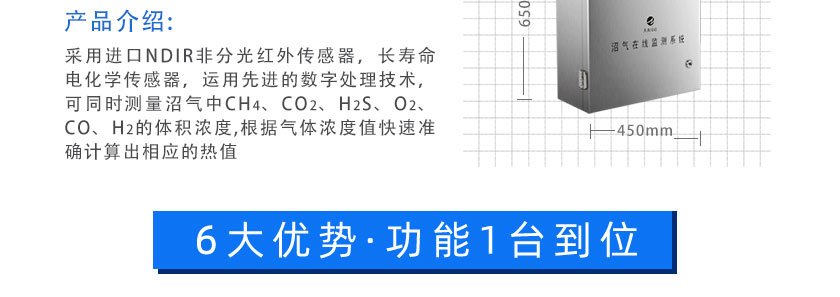 采用進口NDIR非分光紅外傳感器,長壽命電化學傳感器,運用先進的數字處理技術,可同時測量沼氣中CH4、CO2、H2S、O2、CO、H2的體積濃度,根據氣體濃度值快速準確計算出相應的熱值。