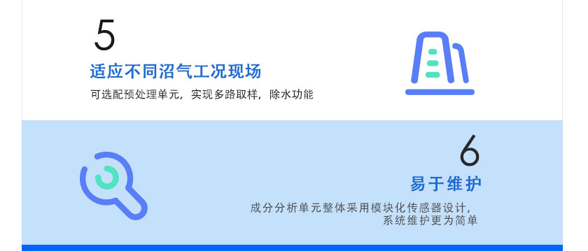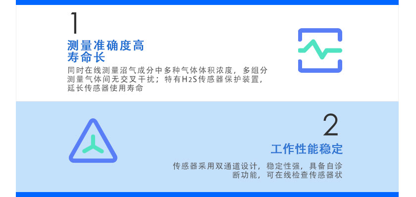 同時在線測量沼氣成分中多種氣體體積濃度,多組分測量氣體間無交叉干擾;特有H2S傳感器保護裝置,延長傳感器使用壽命