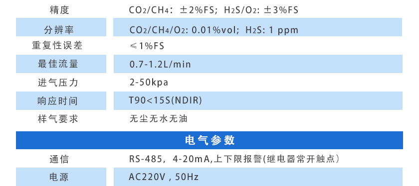 CO2/CH4:±2%FS;  H2S/O2:±3%FS