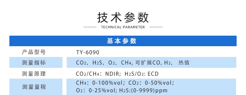 • 防爆壁掛式沼氣分析系統 TY-6090EX 采用進口NDIR非分光紅外傳感器,長壽命電化學傳感器,運用先進的數字處理技術,可同時測量沼氣中CH4、CO2、H2S、O2、CO、H2的體積濃度,根據氣體濃度值快速準確計算出相應的熱值。