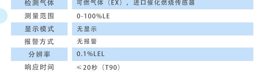 采用進口催化燃燒傳感器和微控制器技術,無顯示,無聲光+視覺報警,適用于各種環境中的可燃氣體濃度檢測,響應速度快,測量精度高,穩定性和重復性好,整機性能居國內領先水平。儀器具有多種超強的電路保護功能,可防止錯接電源、反接電源、電源短路、電源不穩、電源與信號錯解等,導致的儀器損壞。