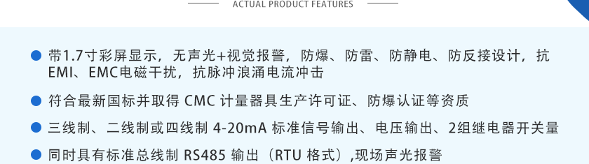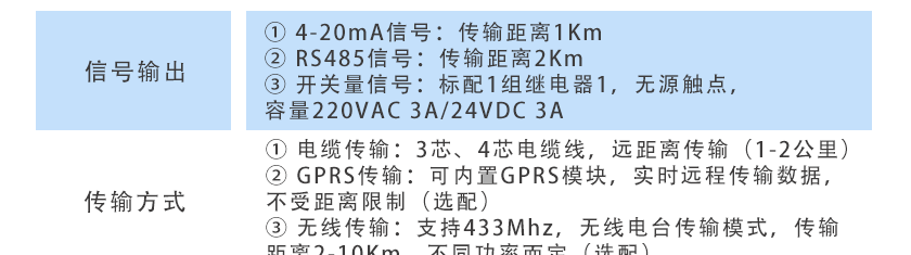 ①4-20mA信號:傳輸距離1Km  ②RS485信號:傳輸距離2Km