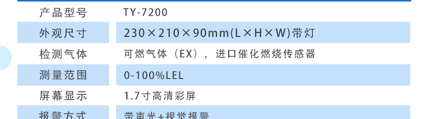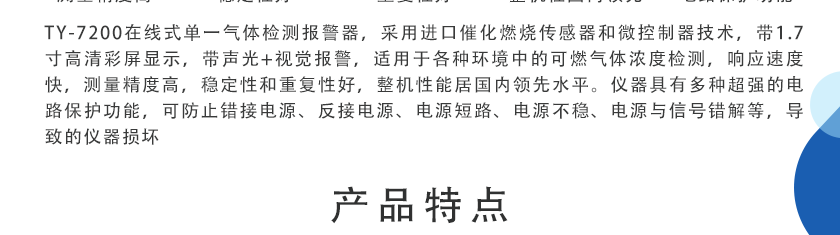 • 在線式單一氣體檢測報警器(帶顯示帶報警) TY-7200 采用進口催化燃燒傳感器和微控制器技術,帶1.7寸高清彩屏顯示,帶聲光+視覺報警,適用于各種環境中的可燃氣體濃度檢測,響應速度快,測量精度高,穩定性和重復性好,整機性能居國內領先水平。