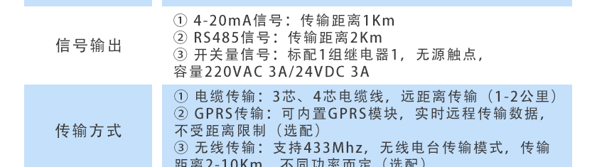 ①4-20mA信號:傳輸距離1Km ②RS485信號:傳輸距離2Km |