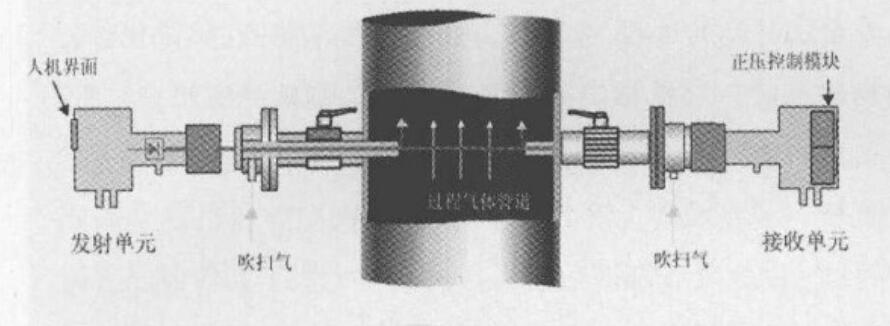 天禹智控的激光過程氣體分析系統(tǒng)的測量探頭由發(fā)射單元和接收單元組成,發(fā)射單元由人機界面、激光器驅動模塊、中央處理模塊、半導體激光器和精密光學元件等器件組成;接收單元由光電傳感器、信號處理模塊、電源模塊和精密光學元件等部分組成;吹掃單元由過濾器、減壓閥和穩(wěn)流裝置等組成;正壓控制模塊采用隔爆設計,內(nèi)置壓力傳感、信號處理、電源控制和信息顯示等模塊(見圖1)。
