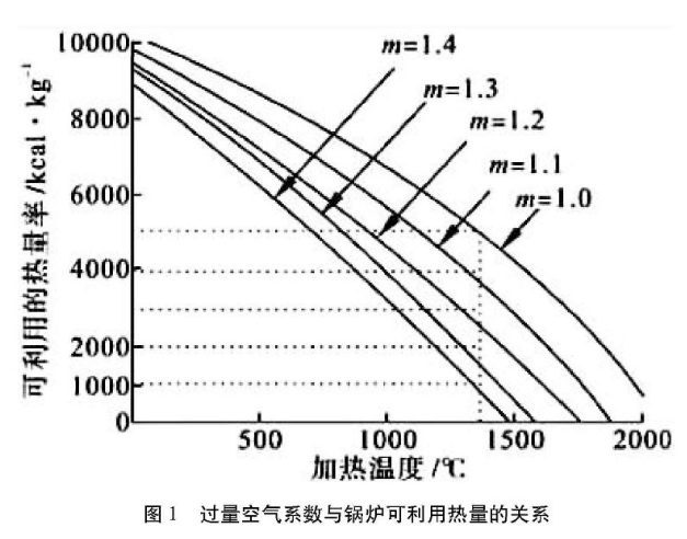 燃?xì)忮仩t運(yùn)行中,過量空氣系數(shù)的選取非常重要,過量空氣少了會導(dǎo)致燃燒不完全,增加Q3熱損失;過量空氣多了會降低煙氣的輻射能力,受熱面的利用率降低,更為重要的是過量空氣的多少會直接影響鍋爐熱效率。本改造項目中,由于燃料主要是燃點較高的高爐煤氣,為保證燃燒完全,采用了較高的過量空氣系數(shù)。但當(dāng)采用富氧燃燒時,由于火焰溫度提高,燃料燃點在富氧條件下也有所降低,因此可以采用較低的過量空氣系數(shù)(見表1)。研究表明,過量空氣系數(shù)越低,鍋爐可利用熱量越高(見圖1)。所以在采用富氧燃燒的鍋爐中,取較低的過量空氣系數(shù),既可以保證燃燒完全,又可以減少排煙熱損失,鍋爐效率明顯提高。