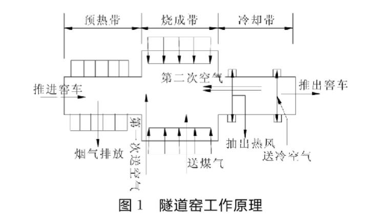 隧道窯可分為三帶∶預(yù)熱帶、燒成帶、冷卻帶。坯體(未燒半成品)干燥至一定水分裝載在窯車上入窯,首先經(jīng)預(yù)熱帶,受到來自燒成帶的燃燒產(chǎn)物(高溫?zé)煔猓╊A(yù)熱,然后進(jìn)入燒成帶,燃料燃燒的火焰及生成的燃燒產(chǎn)物加熱坯體,使達(dá)到一定的溫度而燒成。燒成的產(chǎn)品最后進(jìn)入冷卻帶,將熱量傳給入窯的冷空氣,冷空氣經(jīng)制品而被加熱后,再抽出送入干燥窯作為干燥生坯的熱源,而磚瓦本身冷卻后出窯。其原理簡圖如圖1所示。