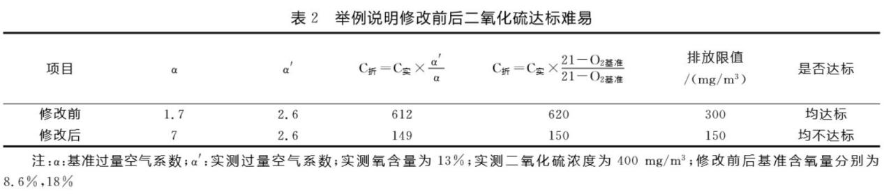 從以上對照表(表1)可以看出,修改單將基準(zhǔn)含氧量更改為18%,這樣更切合隧道窯工藝實際情況,關(guān)鍵點就在這里,因磚瓦窯含氧量一般在17%~20%。二氧化硫的排放限值由300 mg/m3調(diào)整為150 mg/m3,看似更加嚴(yán)厲,其實較之前更容易達(dá)標(biāo)。例如某隧道窯實測含氧量為13%,二氧化硫?qū)崪y濃度為 400 mg/m2,按照修改前后計算是否達(dá)標(biāo),見表2。