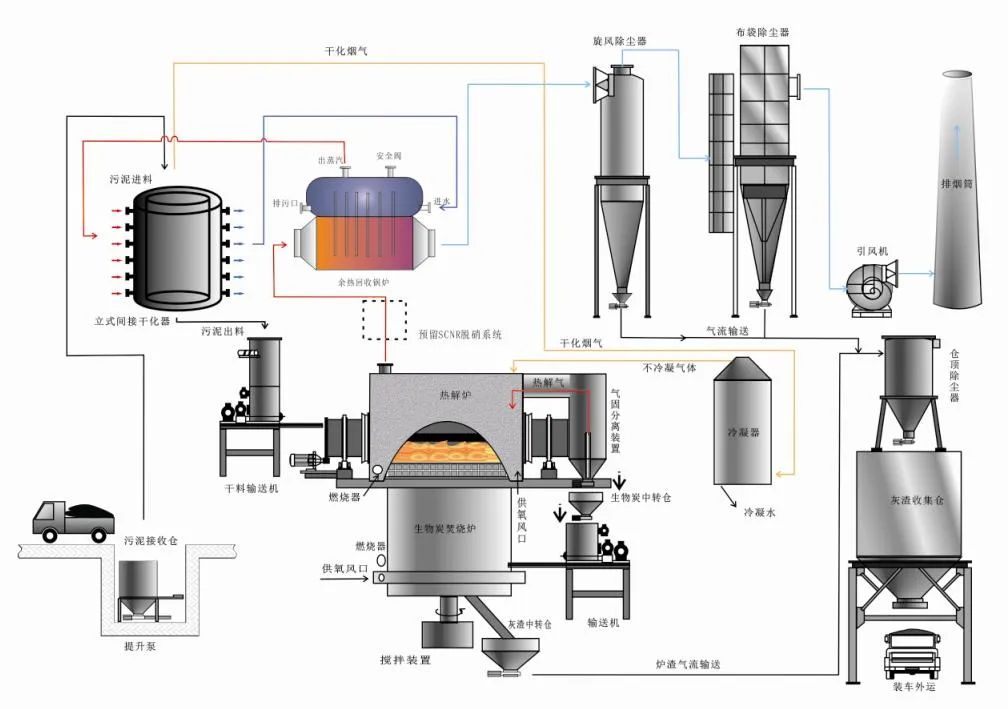 2. 脫水污泥被輸送至干化器,通過直接與熱煙氣接觸,在干化器內實現加熱和干化;經干化后的物料與一定比例的輔助燃料充分混合后進入立式清潔焚燒爐焚燒,干化后的尾氣經尾氣處理系統清潔凈化后,無煙潔凈排放;