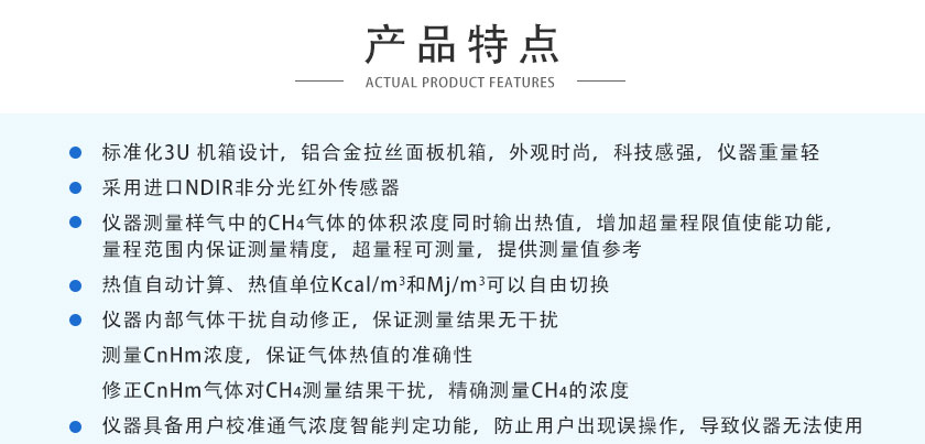 3)儀器測量樣氣中的CH4氣體的體積濃度同時輸出熱值。增加超量程限值使能功能,量程范圍內保證測量精度,超量程可測量,提供測量值參考。