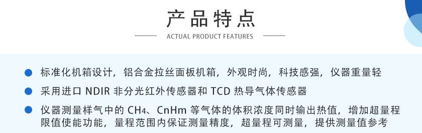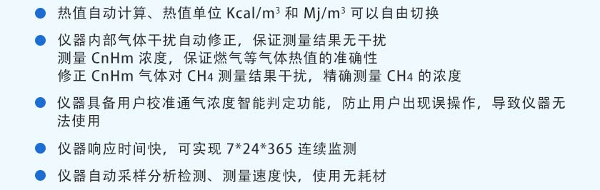 采用進(jìn)口NDIR非分光紅外傳感器,長壽命電化學(xué)傳感器,運用先進(jìn)的數(shù)字處理技術(shù),可同時測量沼氣中CH4、CO2、H2S、O2、CO、H2的體積濃度,根據(jù)氣體濃度值快速準(zhǔn)確計算出相應(yīng)的熱值。
