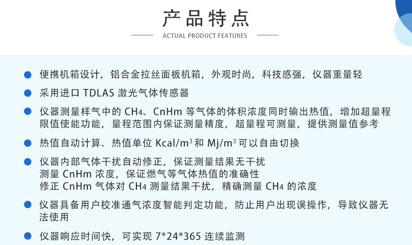 采用國際先進的TDLAS激光技術,主要用于測量各種天然氣、生物燃氣中的CH4、CnHm?等氣體體積濃度及熱值。 武漢天禹智控研發的在線激光天然氣熱值儀標準化機箱、測量精度高、結構簡單、維護方便,軟件功能強大,可拓展性強、現場實用性好,目前暢銷國內外。 適用于高校、環境科研機構,燃氣計量檢測部門、節能監測部門,液化氣廠、液化氣站、天然氣公司等直接用戶,燃氣具生產企業、廠商測量可燃氣體不同成分的體積濃度和熱值。