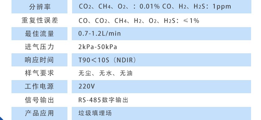 CO、CO2、CH4、:NDIR非分光紅外 H2:TCD熱導, O2、H2S:ECD電化學 |