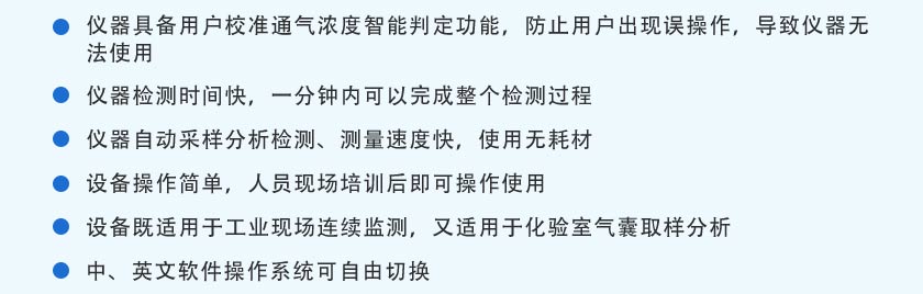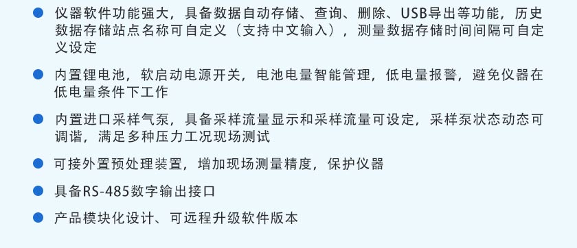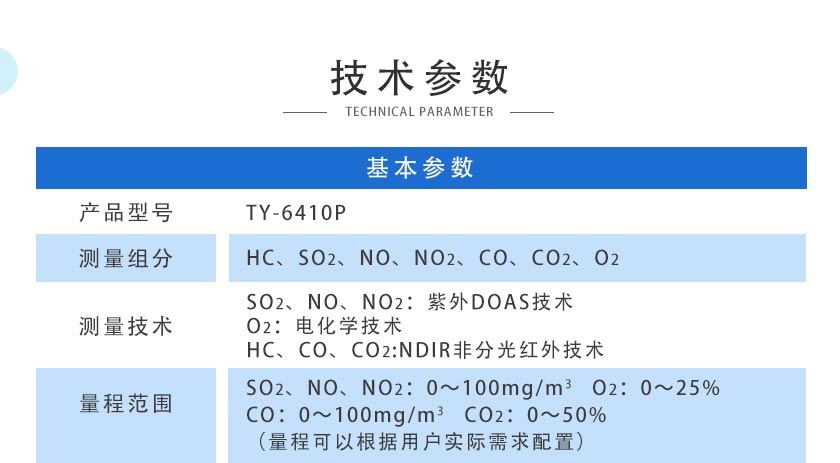 SO2、NO:0~200~2000mg/m3;O2:0~25%;CO:0~625mg/m3;CO2:0~65%(量程可以根據用戶實際需求配置)